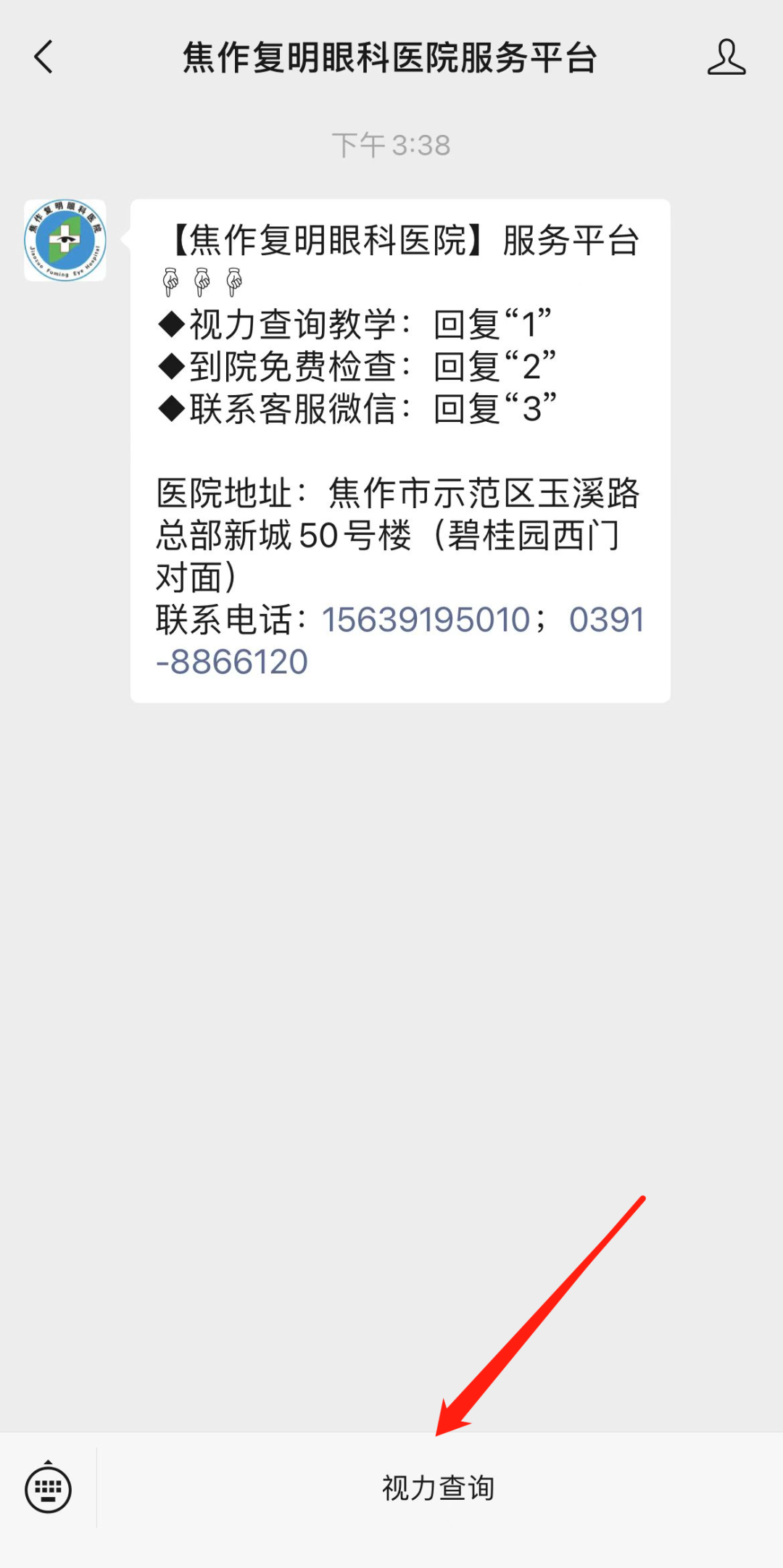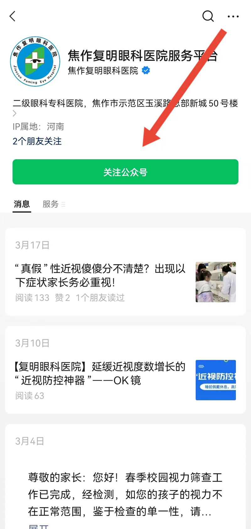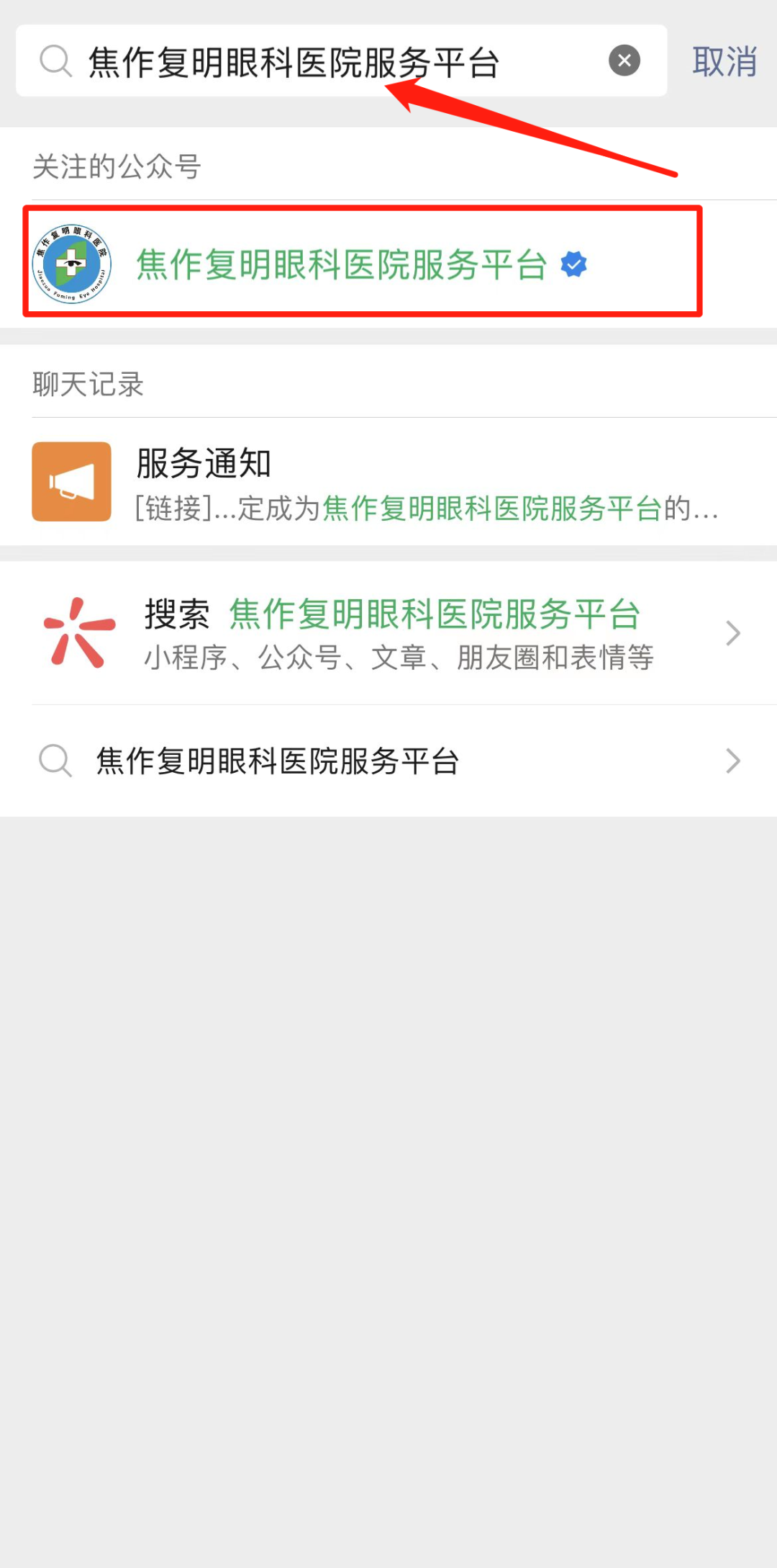 步驟一:關注“焦作復明眼科醫院服務平臺”